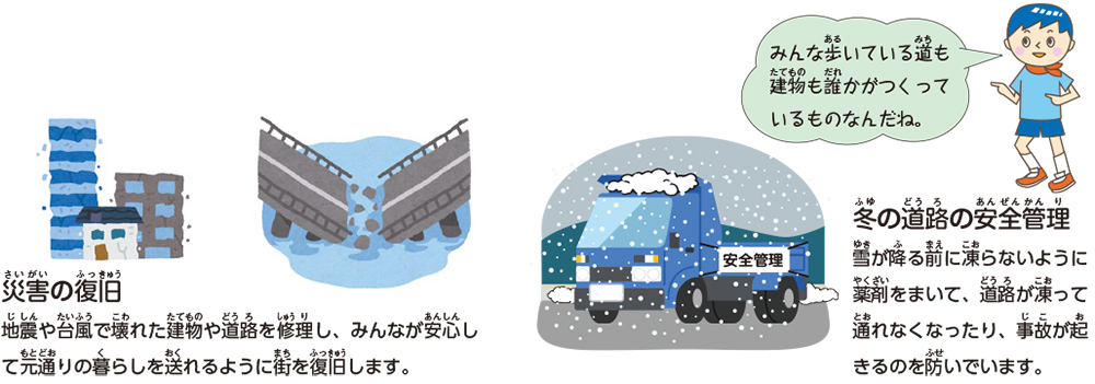 私たちが暮らす街には、さまざまな建物や道路があります。これらは、何もなかった土地を整えて、人の手によって、つくり上げられてきたものです。私たちの普段の暮らしを守り、安全で快適な社会を支えるために欠かせない、大切な仕事です。