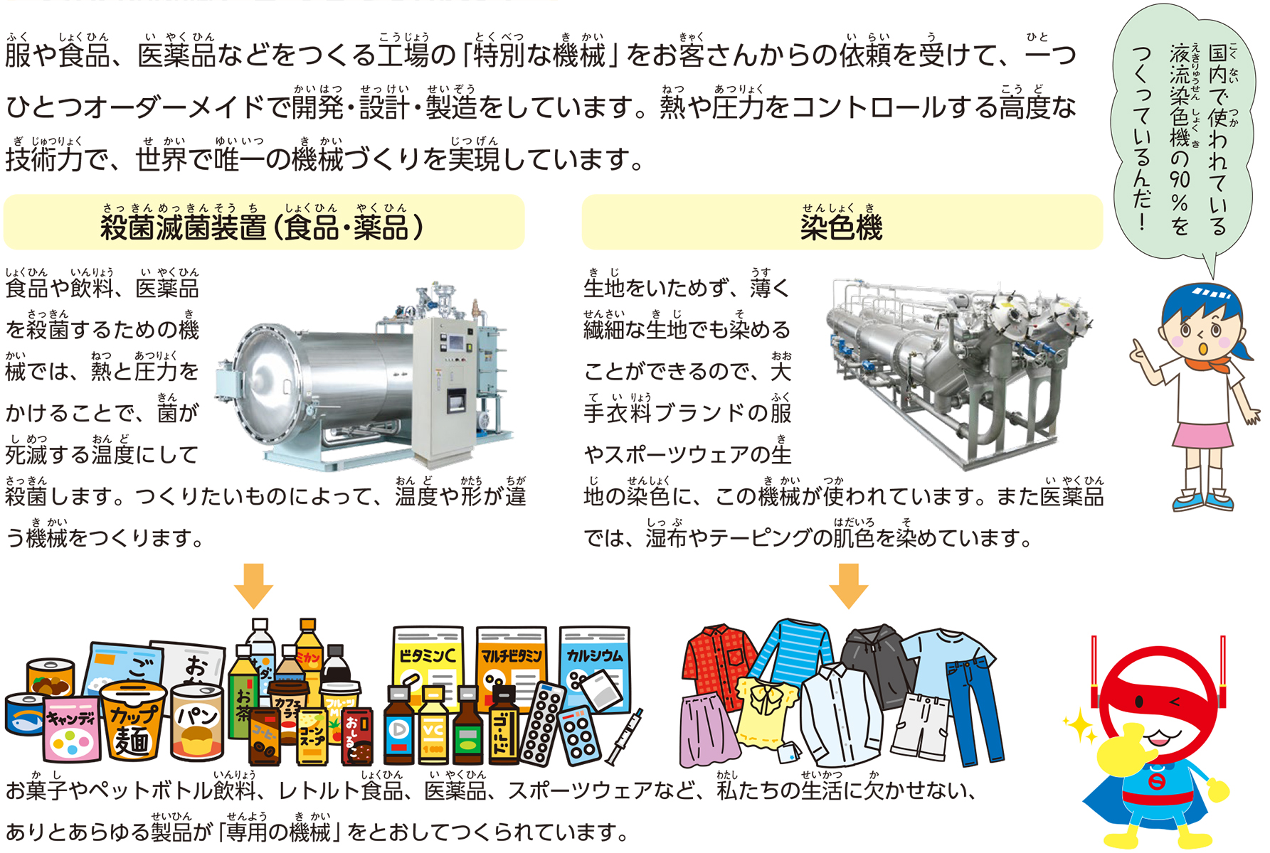 私たちの暮らしに欠せない「衣・食・住・医」の製品をつくる工場や製造工程には、必ず専用の機械が使われています。これらの機械は、圧力や温度などを制御する高度な技術を活かして、安全・安心なものづくりを支え、私たちの生活の見えないところで活躍しています。