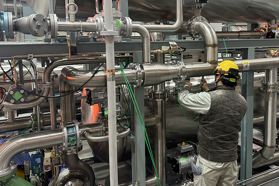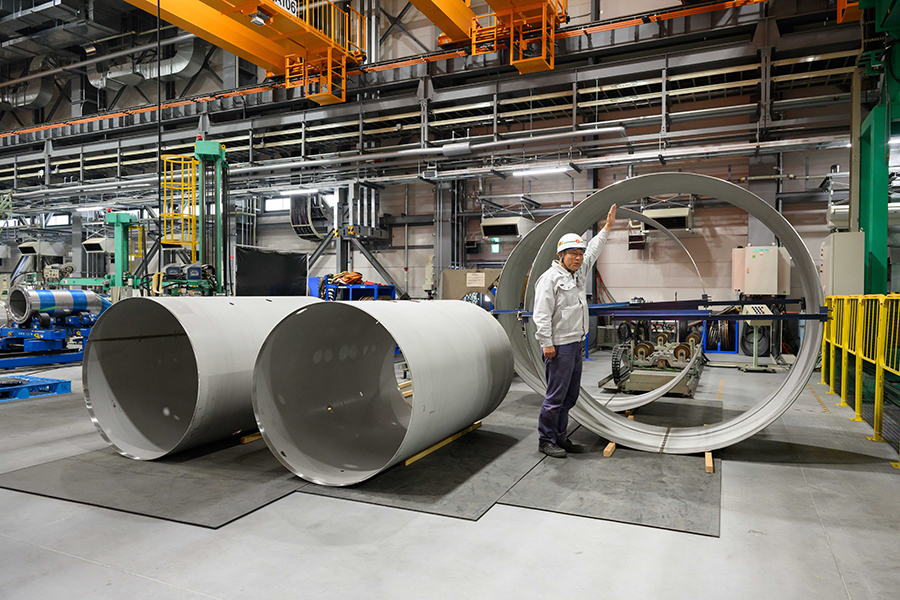 平らな板を丸くして、機械の本体をつくります。周りの部品や配管も取り付けます。