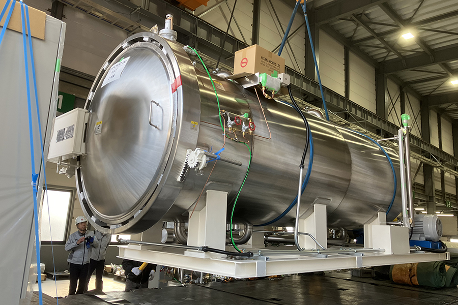 工場で製品を製造する際に発生する熱エネルギーを、熱が冷めないようにそのまま保って、次の製品を作る時に再利用する、省エネの殺菌・滅菌機械を開発しました。