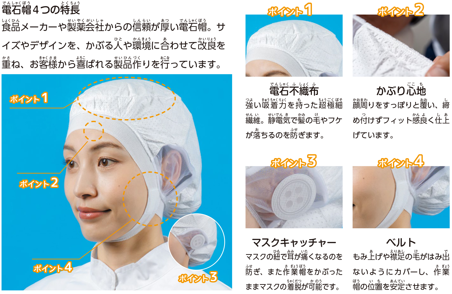 食品や薬品、プラスチック容器を製造する工場では、安心安全な商品を消費者に届けるため、髪の毛や虫、ホコリなどの異物混入対策が欠かせません。対策の必需品となる「かぶり心地が良く、髪の毛が出ない作業帽」や「虫をとおさないフィルター」などを作っています。